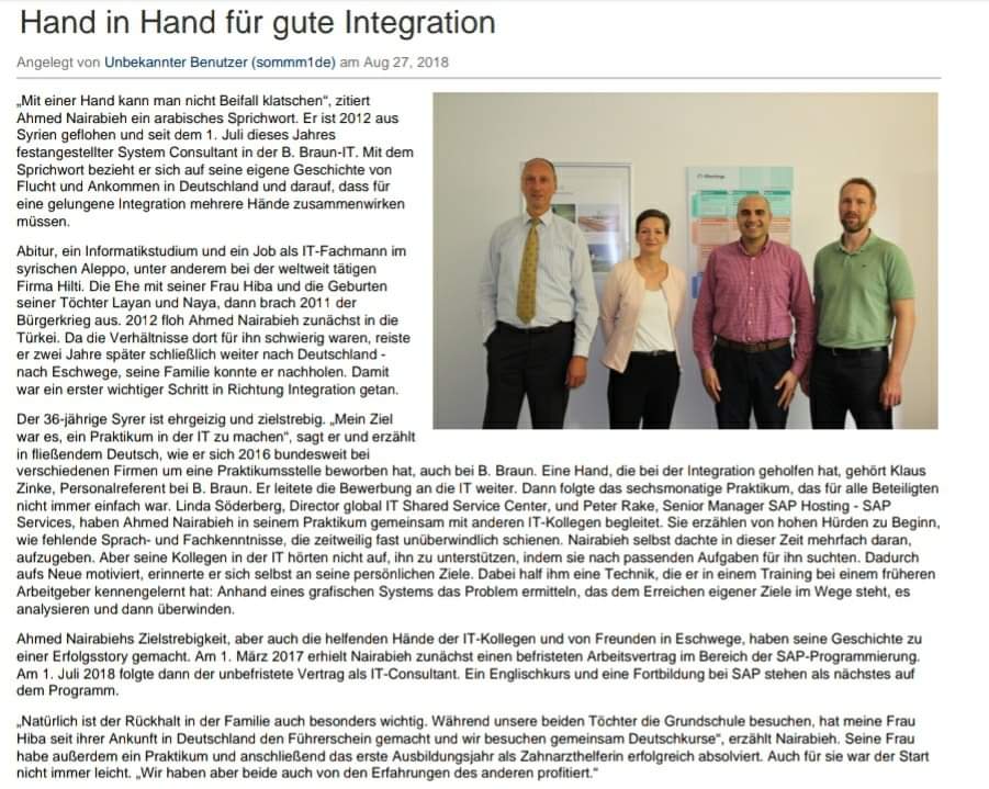 وفي شهر تموز عام 2016 جاءه رد إيجابي من إحدى كبرى الشركات الطبية في ألمانيا الموجودة في مدينة ملسونغن تدعى B. Braun Melsungen AG وذلك لإجراء مقابلة معه وكانت المقابلة الأولى في نهاية شهر تموز من العام 2016.