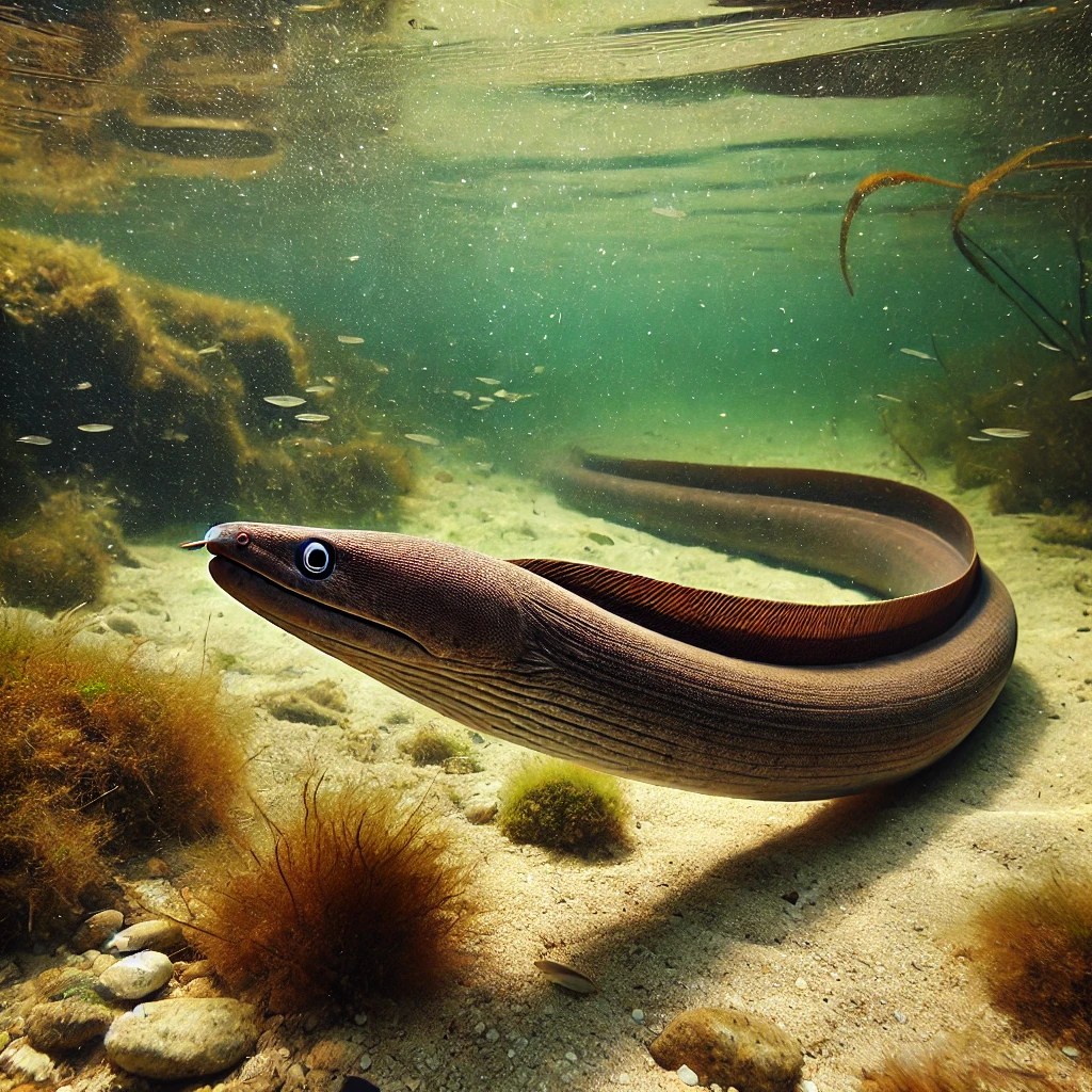 - الوصف: سمكة طويلة ورفيعة تشبه الثعبان، ذات جسم أملس ولون بني داكن.