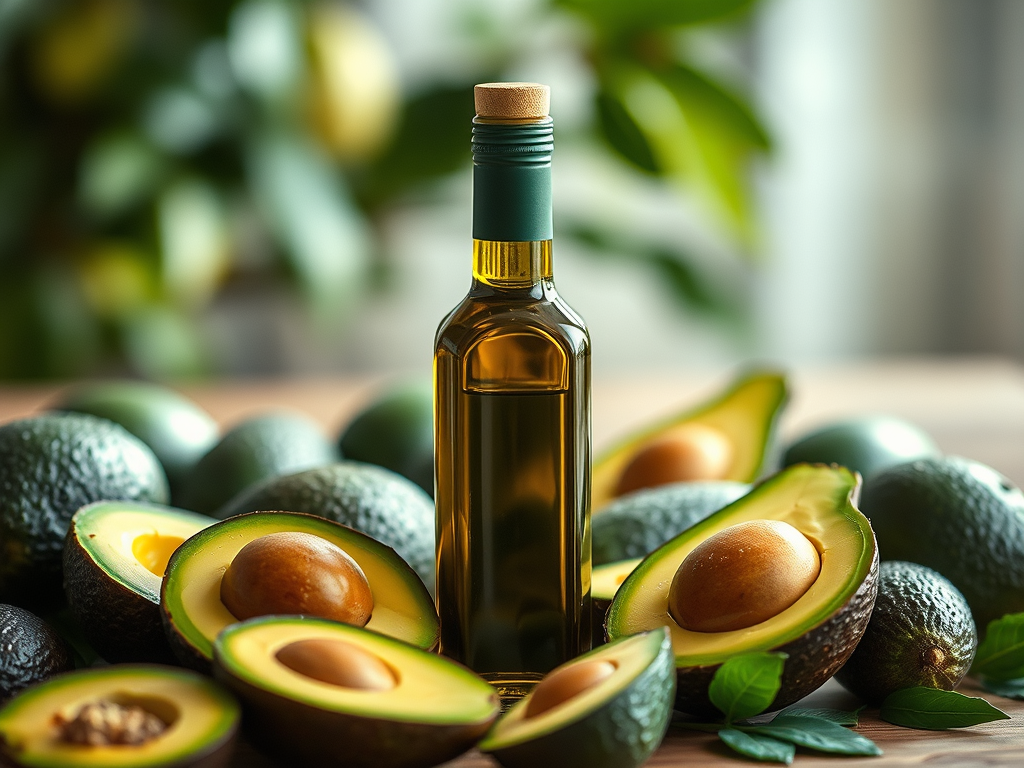 - الوصف: يُستخرج زيت الأفوكادو من لب فاكهة الأفوكادو ويتميز بنكهة خفيفة ولونه الأخضر. يحتوي على نسبة عالية من الدهون الصحية.