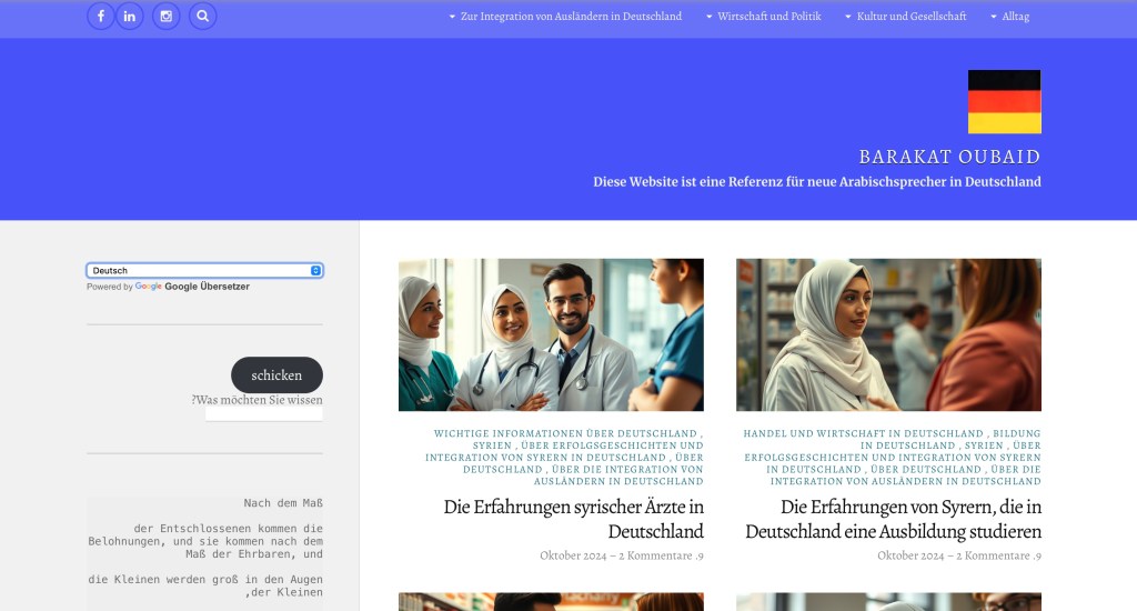 Barakat Oubaid betreibt eine Webplattform, die speziell auf die Bedürfnisse arabischsprachiger Neuankömmlinge in Deutschland zugeschnitten ist. Die Seite bietet umfassende Informationen zu den wichtigsten Themen wie Bildung, soziale Unterstützung und Integration, und enthält praktische Ratschläge für den Alltag in Deutschland. Darüber hinaus gibt es spezielle Bereiche, in denen Erfolgsgeschichten syrischer Geflüchteter dokumentiert werden, um positive Beispiele für eine gelungene Integration sichtbar zu machen.